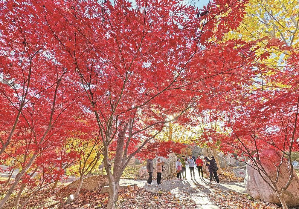 时值深秋,南湖景区里的唐山植物园色彩斑斓,红彤彤的枫叶与园中其他植物共同绘就绝美秋日画卷。图为11月9日游人在枫树林间驻足赏秋。