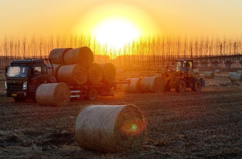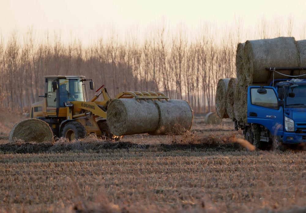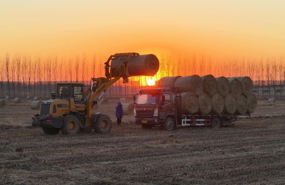 ↑12月27日,稻草回收企业的工人在唐山市丰南区西葛镇的田间将打包好的水稻秸秆装车转运。
