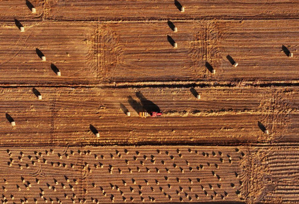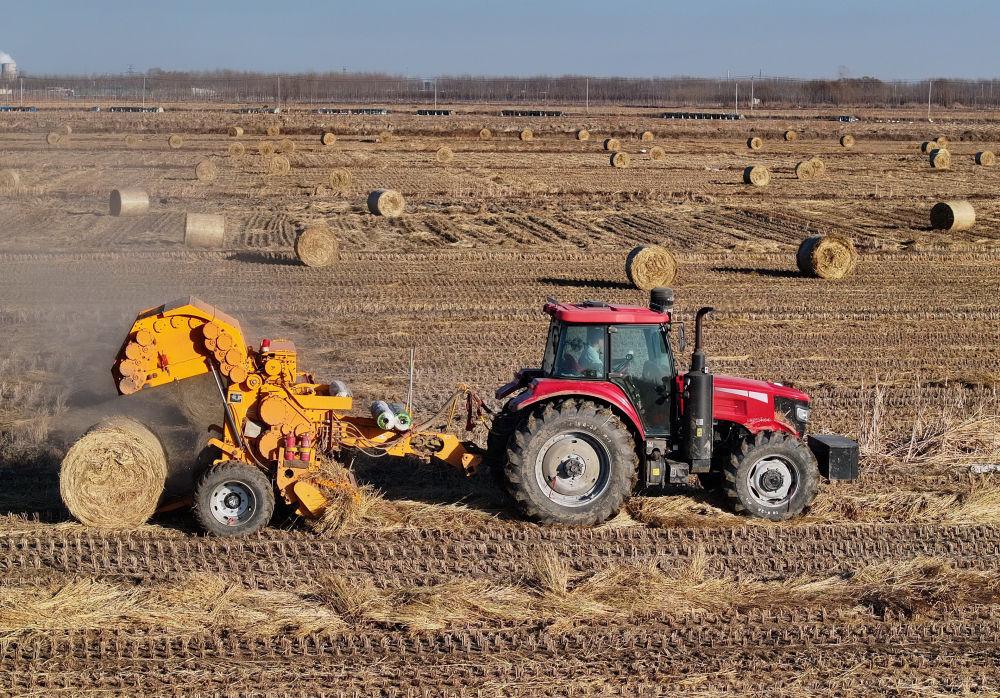 ↑12月27日,农机手驾驶农机在唐山市丰南区西葛镇的田间将水稻秸秆打包回收(无人机照片)。