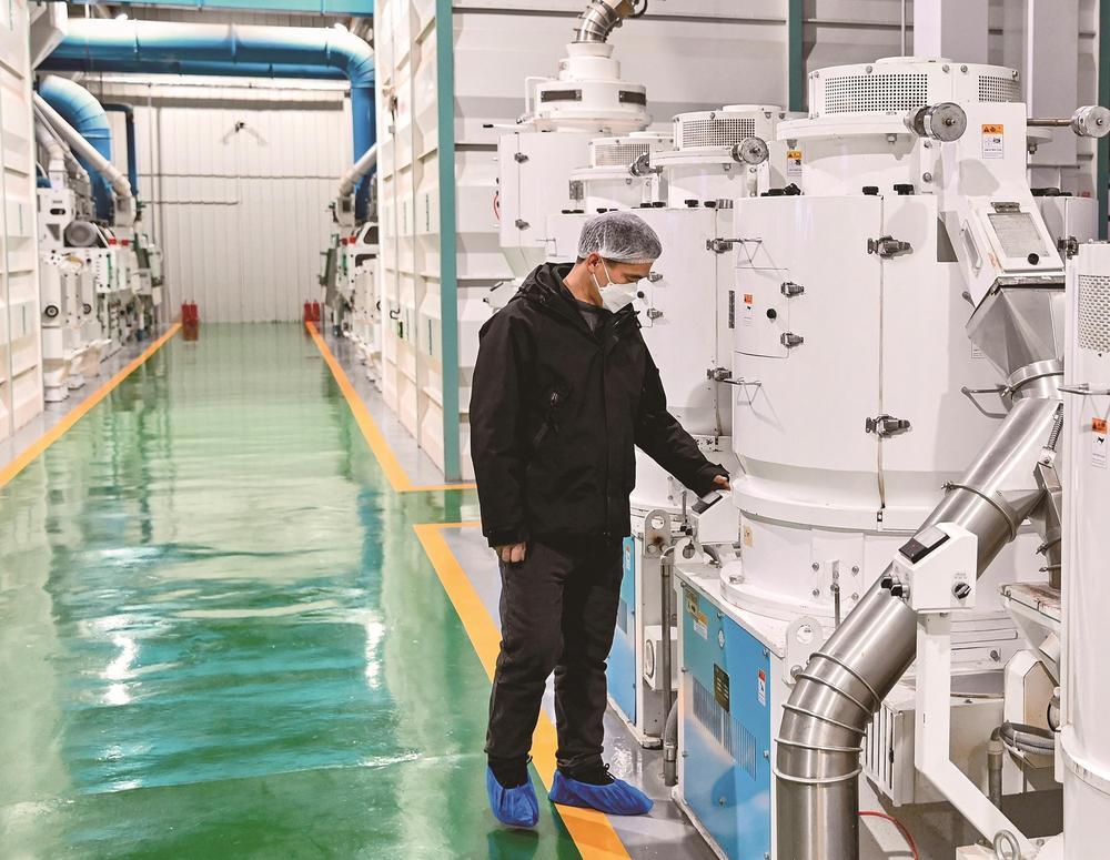 图为工作人员观察米机流量。