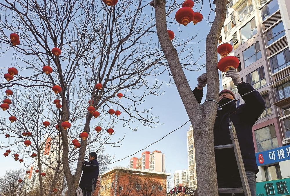 图为路南区惠民道街道工作人员将一只只红灯笼悬挂枝头。