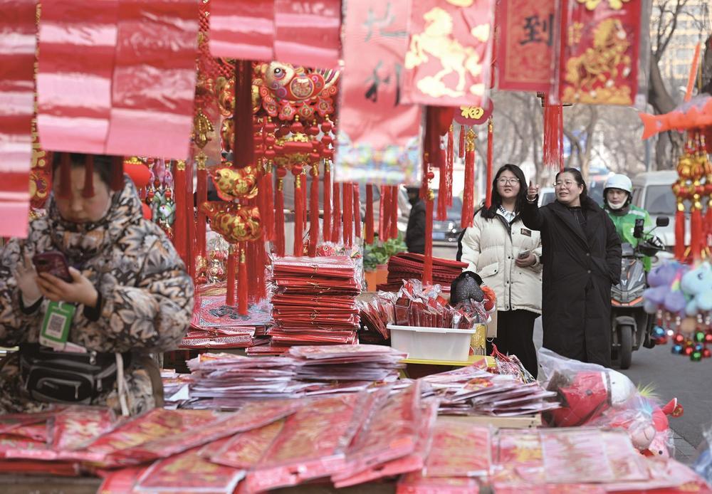 春节的脚步悄然临近,街头巷尾弥漫着愈发浓郁的年味。2月11日,一家商铺前,商家正忙着摆货,市民在挑选春联、灯饰,赶在年前将家装扮得更加喜庆。