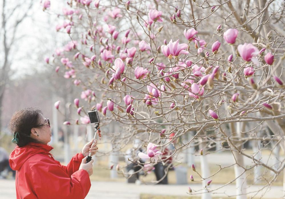 图为唐山植物园内玉兰花竞相开放,引得游人纷纷前来观赏。杜雯拓 摄