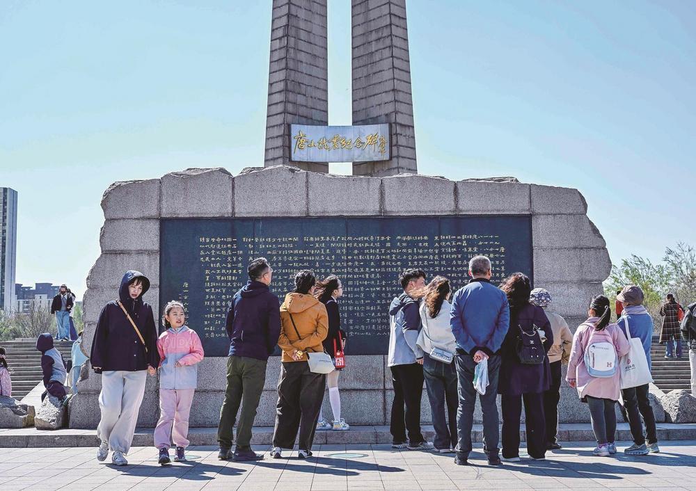 图为游客阅读唐山抗震纪念碑碑文。记者 徐慧 摄