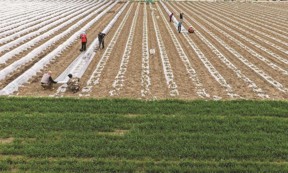 4月13日,河北省唐山市玉田县虹桥镇农民在田间给种植的蔬菜铺地膜(无人机照片)。