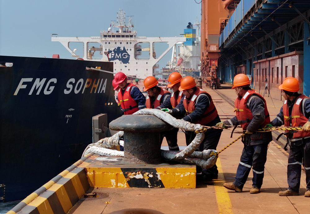 ↑4月15日,工人在唐山港曹妃甸港区矿石码头为一艘正在靠泊的轮船系缆绳(无人机照片)。