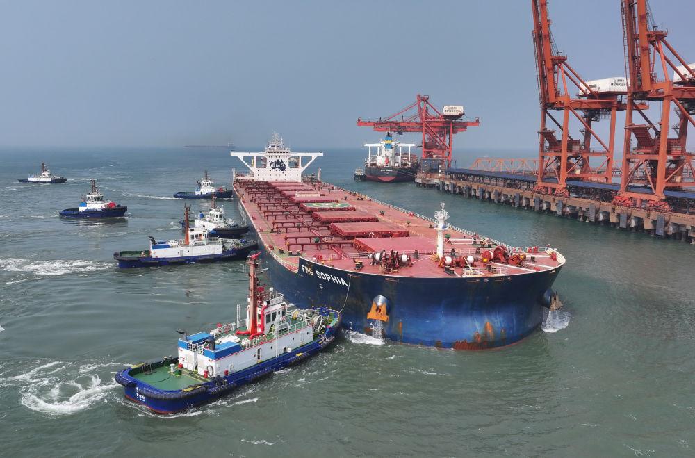 ↑4月15日,一艘轮船在拖轮协助下驶离唐山港曹妃甸港区矿石码头(无人机照片)。