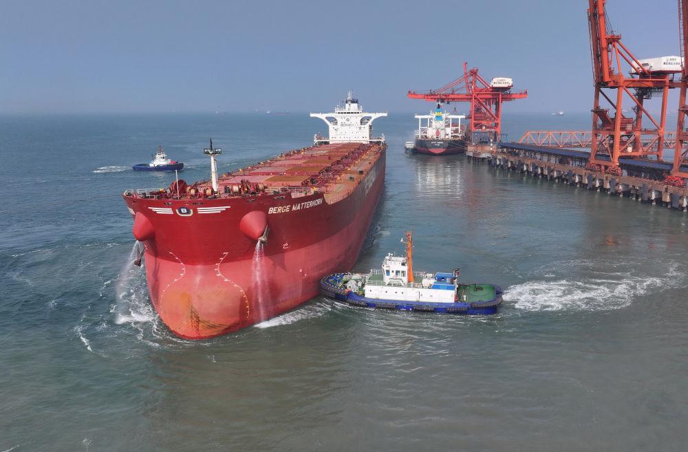 ↑4月15日,一艘轮船在拖轮协助下向唐山港曹妃甸港区矿石码头靠泊(无人机照片)。