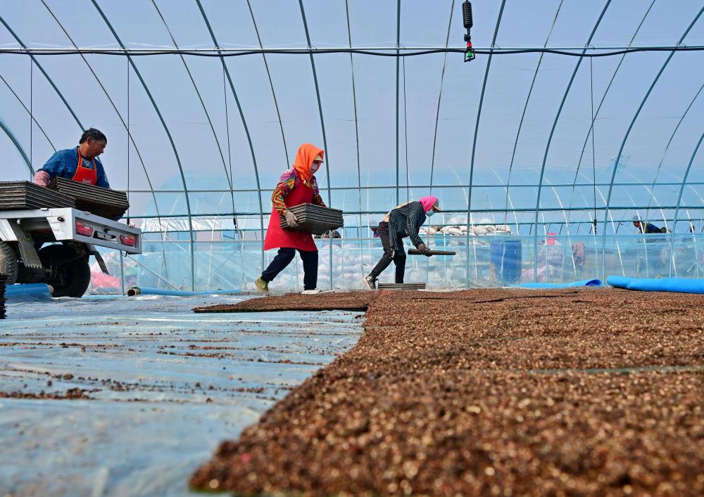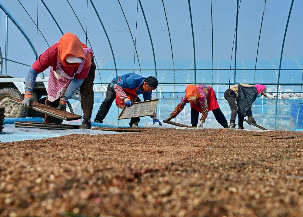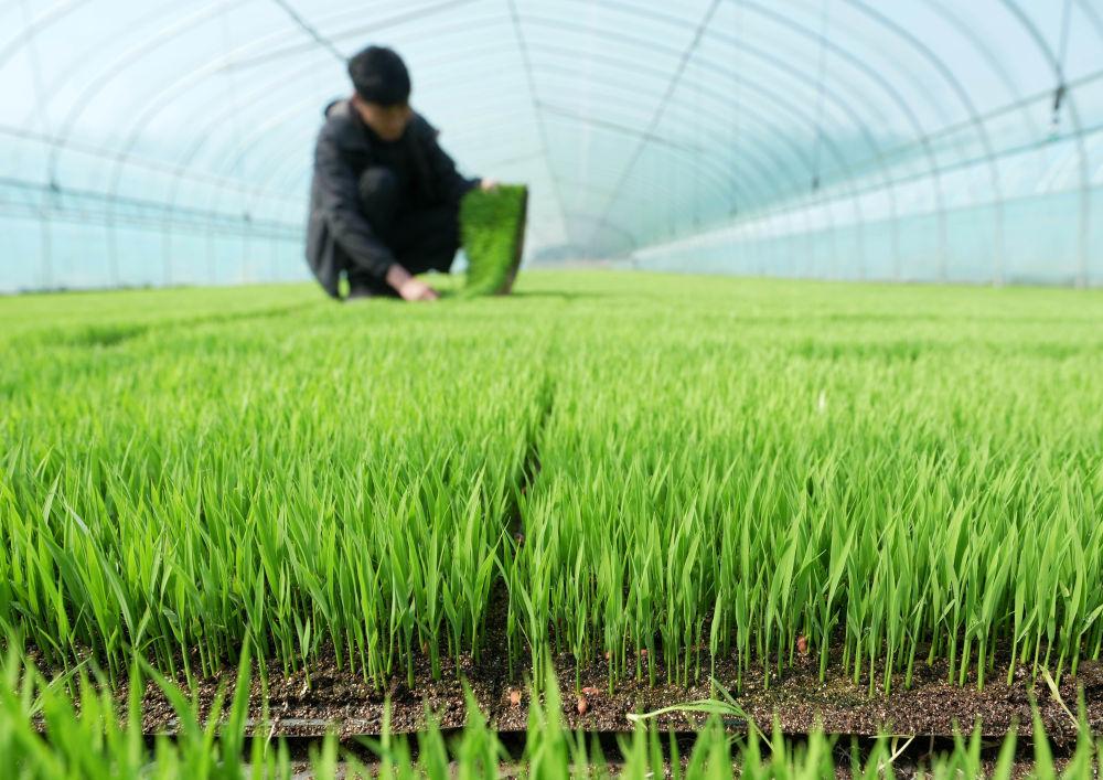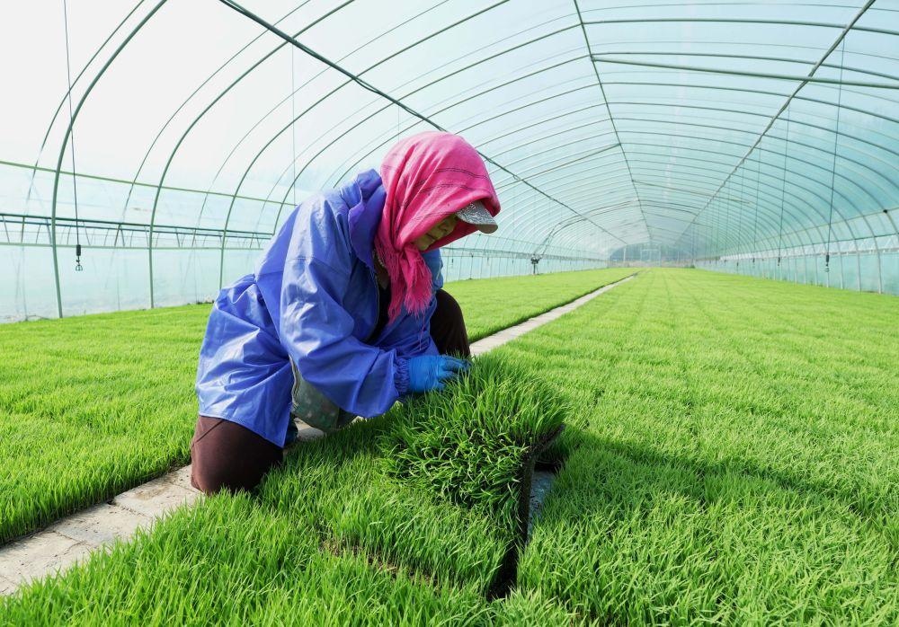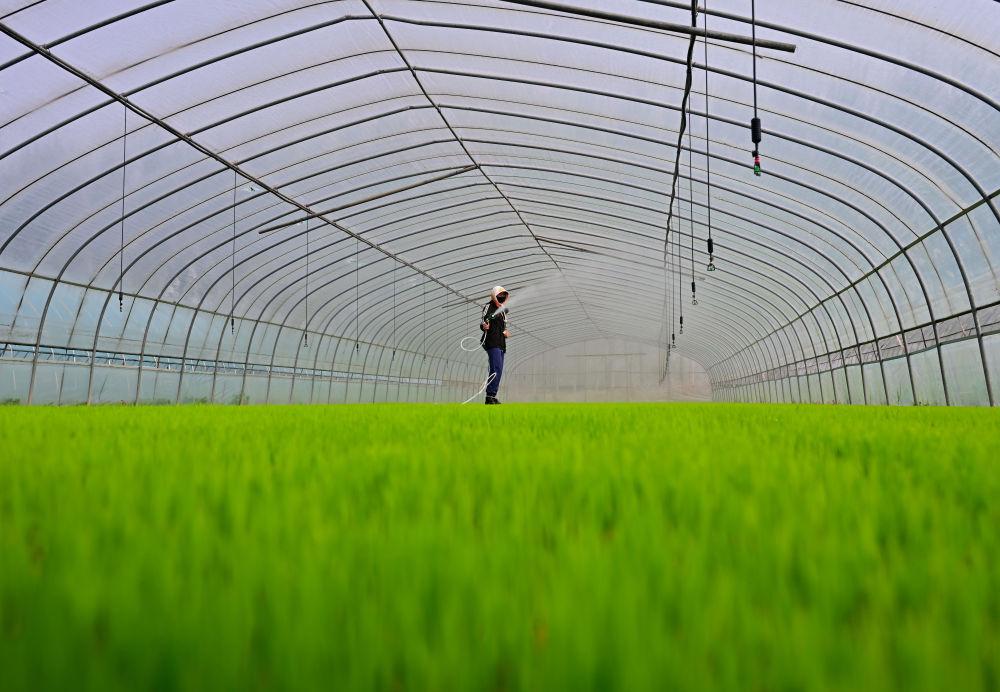 ↑4月23日,唐山市曹妃甸区第四农场的农民在大棚里管护水稻秧苗。时下正值春季农事关键期,河北省唐山市曹妃甸的农民抢抓农时进行水稻育秧等工作,田间地头一派繁忙景象。