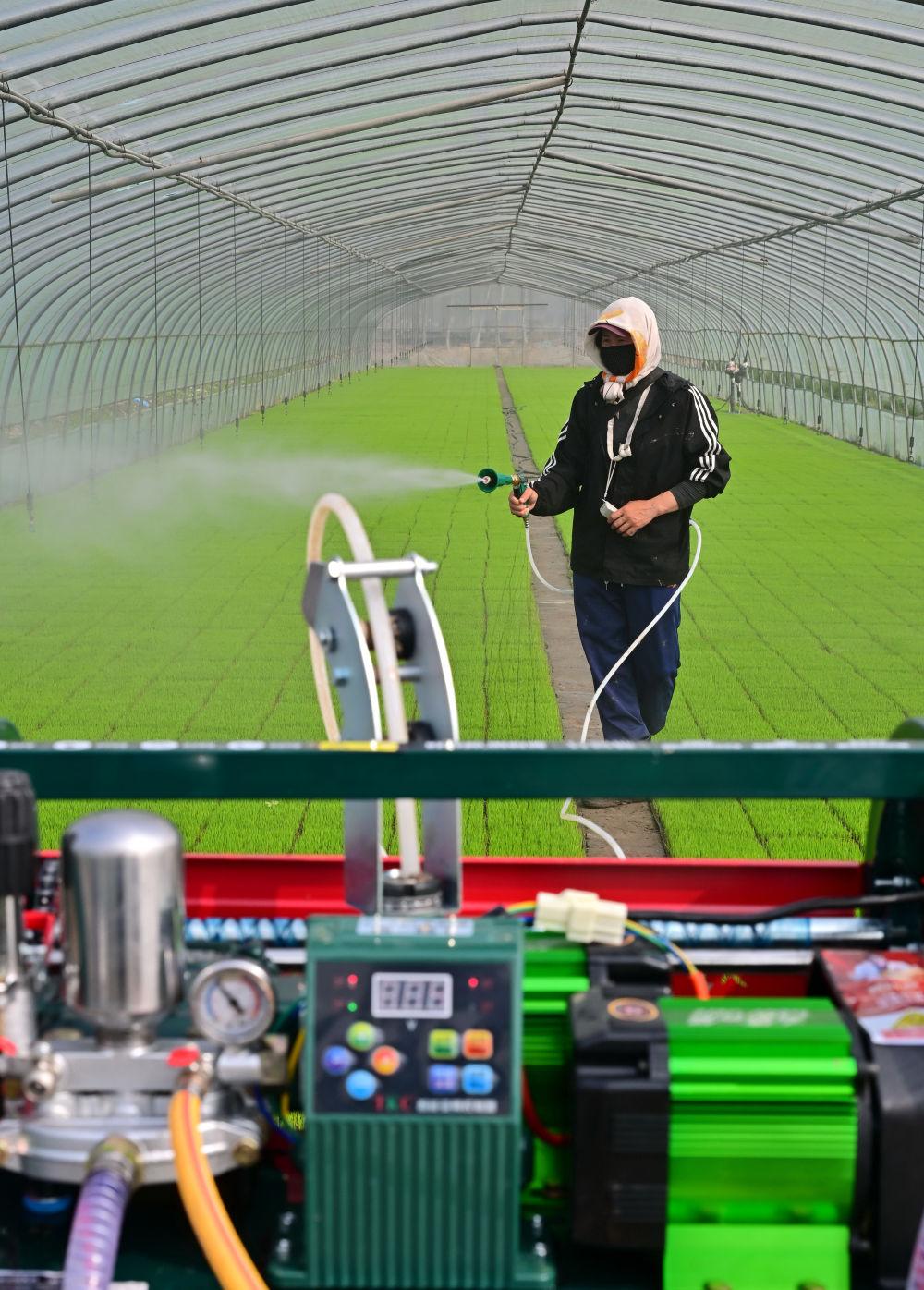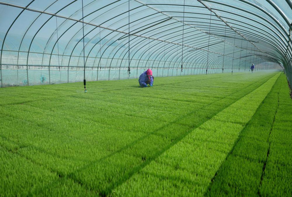 ↑4月23日,唐山市曹妃甸区第四农场的农民在大棚里管护水稻秧苗。